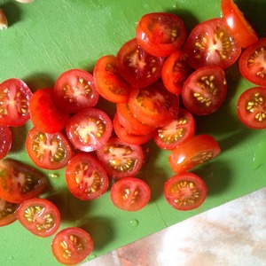 6. В сковороду, где обжаривали грудку, добавляем оливковое масло, обжариваем чеснок, добавляем перец чили, оливки и томаты.