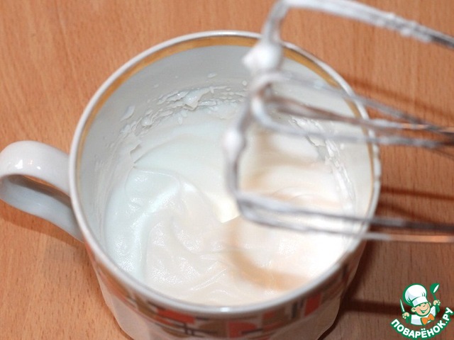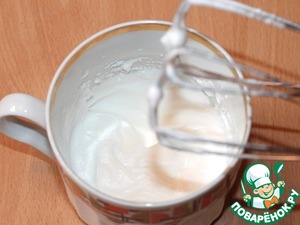 Приготовим крем: в охлажденный белок добавим щепотку соли и взбиваем с помощью миксера до густой пены (пиков).