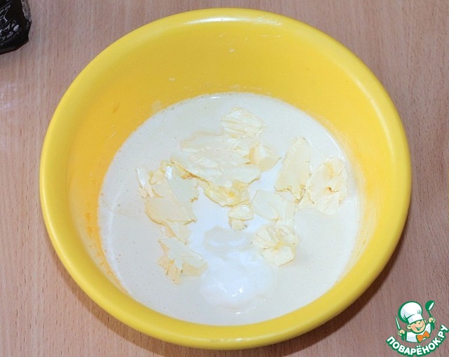 • Разделить яйцо на желток и белок. Желтки взбить с 50 г сахара до бела, так чтобы крупинки не были видны. Белки убираем пока в холодильник. Добавить сметану, размягченное сливочное масло и взбить миксером.