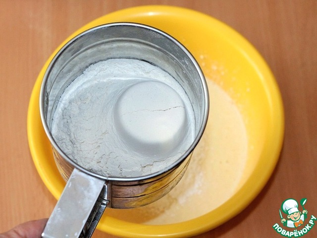 Затем в желтково-маслянную смесь добавьте просеянную муку с разрыхлителем и ванилином. Хорошо перемешайте.
