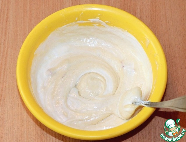 По 1-2 ст. л. вводим в тесто взбитые белки, аккуратно вмешиваем, круговыми движениями. Не взбивать!!! Получилась масса по консистенции как густая сметана.