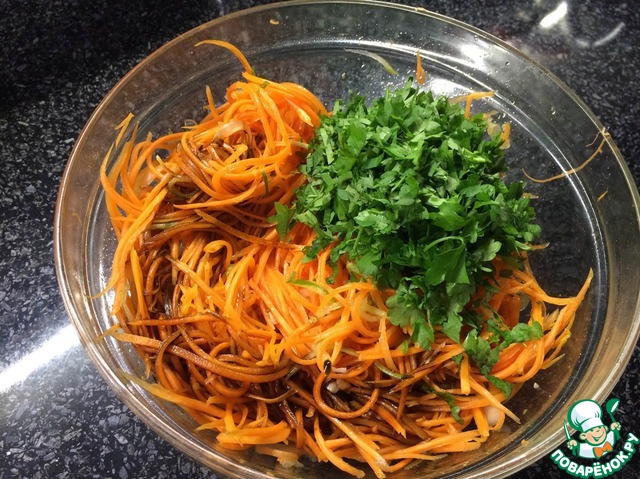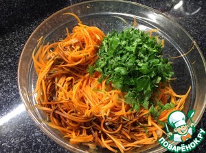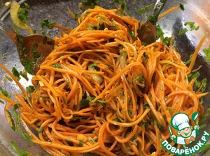 • Морковь натереть на терке "для корейской морковки". Старайтесь, чтобы соломка получалась длинная.