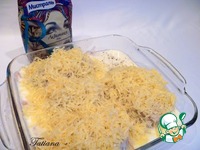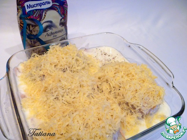 В йогурт добавьте соль (0,3 ч. л.), влейте йогурт поверх кальмаров (соус должен покрыть кальмаров до половины), сверху поперчите, посыпьте тертым сыром. |