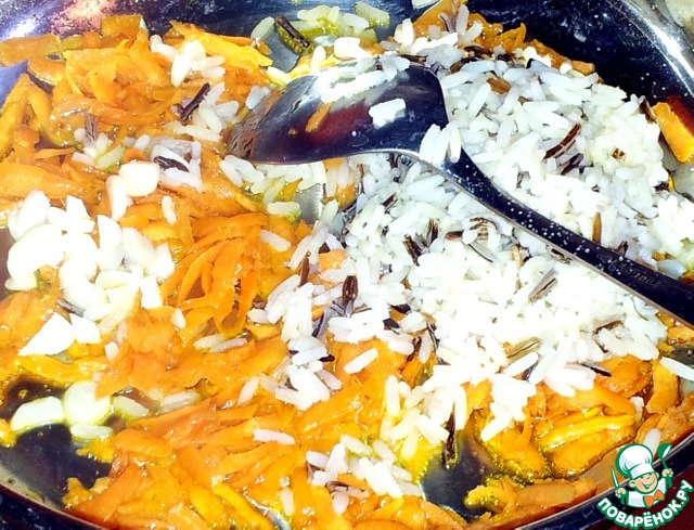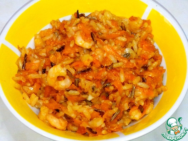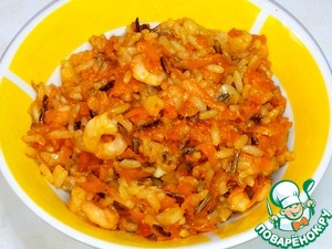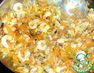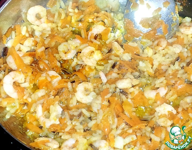 К моркови и рису добавила креветки и обжарила ещё две минуты.