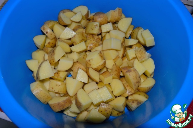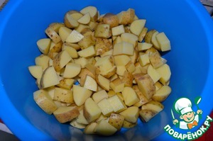 Картошку хорошенько помыть, чистить мы её не будем. Для этих целей можно просто "завести" новую губку, эту картошку Вы всё равно ещё не раз будете готовить... Затем режем картошку не слишком мелко и кладём в какую-нибудь глубокую ёмкость. После этого добавляем масло, перец, соль и чеснок. Хорошенько всё перемешиваем.