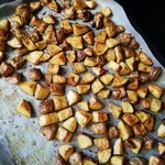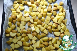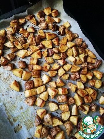 Выстилаем противень бумагой для выпечки, поверх неё высыпаем нашу картошку. Если у Вас есть мясо для выпекания, выкладываем его тоже сейчас. Выпекаем в духовке 30 минут при температуре 200 - 220 градусов. У меня духовка электрическая, поэтому времени требуется меньше. Когда выпекала такую же картошку у бабушки в газовой духовке, то ушёл почти час при 220 градусах. Так что советую в первый раз последить за картошкой, чтобы определить "своё" время.