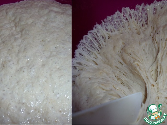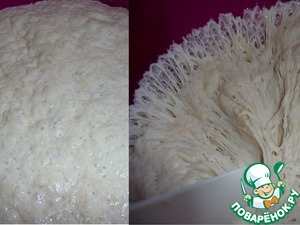 Утром получилась такая закваска. Замесить мягкое и гладкое тесто. Я загрузила все продукты в Х/П и включила режим "Тесто", процесс замеса и расстойки длится 90мин. Если делать тесто руками, месить нужно минут 20, накрыть тесто и поставить в теплое место на расстойку на 60-90мин., объем должен увеличится в 2 раза.