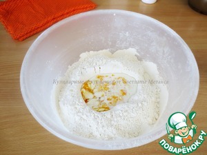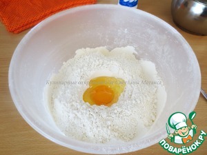 В муке сделать углубление, добавить яйцо