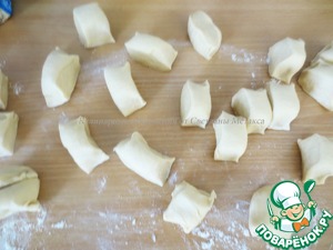 Отдохнувшее тесто разделить на 20 одинаковых частей. Накрыть полотенцем.