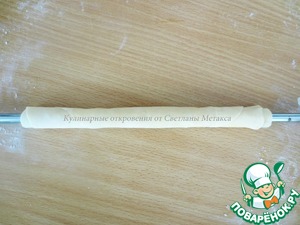 С помощью металлической палочки ( можно использовать обыкновенный карандаш) свернуть тесто в рулет.