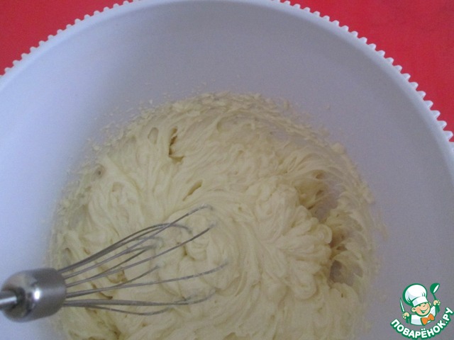 Высыпать сухую смесь в подготовленную масляную смесь и замесить с помощью миксера тесто. Тесто получится мягкое, густое.