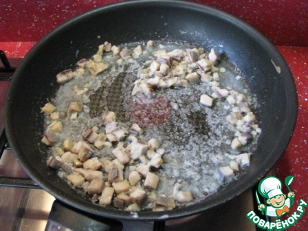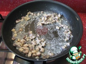 Сельдь порезать кубиками, выложить на сковороду, добавить 2 ст. л. масла и на среднем огне слегка припустить.
