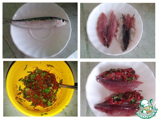 Чистим рыбку удаляя головы, хвосты, плавники, внутренности и хребты. Получаем филешки))) В глубокой тарелке смешиваем томатную пасту, специи, соль, чеснок пропущенный через пресс и мелко рубленную зелень. Начинку выкладываем на одну половинку филе...