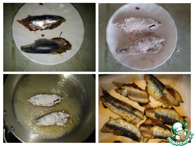 Прикрываем ее второй половинкой, обваливаем рыбешку в муке. Обжариваем по 1 минуте с обеих сторон на сковороде в раскаленном масле и перекладываем рыбку на тарелку устеленную бумажным полотенцем, чтоб ушел лишний жир.