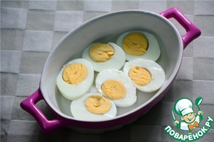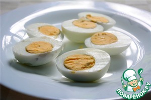 Яйца отварить, остудить и очистить. Разрезать на половинки.