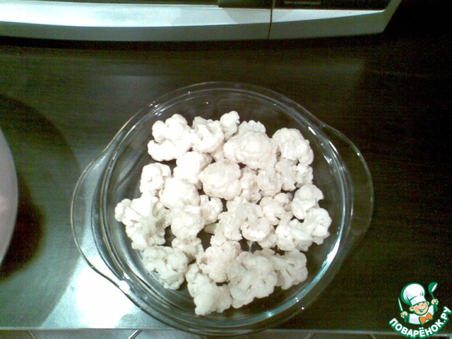 Цветную капусту тщательно вымыть в проточной воде и разобрать на мелкие соцветия. На плиту ставим кастрюлю с подсоленной водой и как только вода начинает кипеть кладем цветную капусту. Варим 2-3 мин. не больше! (нам каша не нужна ;) )