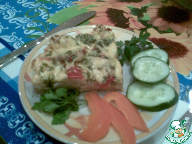 Выкладываем на цветную капусту моцареллу, помидор и заливаем овощи получившимся соусом.