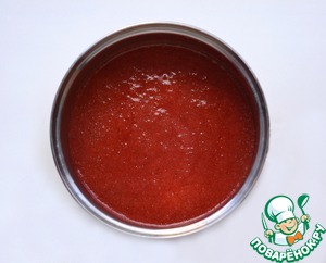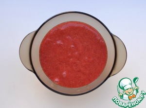 Клубничный крем лучше приготовить заранее. Для этого пробить клубнику с сахаром блендером.