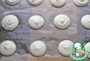Тесто для макарун кладем в кондитерский мешок с круглой насадкой и отсаживаем небольшими лепешками на противень. Расстояние между заготовками должно быть 3-4 см. После этого противнем нужно несколько раз постучать о жесткую поверхность, чтобы вышли пузырьки воздуха из заготовок. Сами же заготовки немного разойдутся, расплющатся и примут ровную округлую форму. Дать заготовкам постоять, чтобы они заветрились, покрылись сверху корочкой. 20-30 минут будет достаточно (проверять пальцем, если прилипает, дать еще постоять).