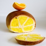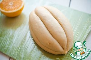 Оставшиеся рыжий и белый куски теста, раскатать в большие пласты. Обтянуть соединенные дольки сначала белым, а потом рыжим тестом и хорошо защипить внизу. Переложить на пекарскую бумагу швом вниз, накрыть пакетом или пленкой и оставить подниматься на 60 минут.
