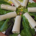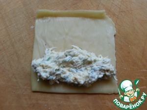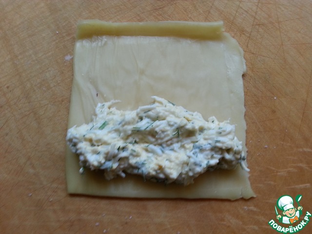 Удалить между пластинками сыра прокладочную бумагу. На один край сыра выложить около 1 ч. л. начинки, зависит от размера сыра. Свернуть сыр с начинкой в трубочку. Начинка может быть разная, на ваш вкус. Я в одну трубочку (в начинку ) добавила порезанную семгу, вышло очень вкусно. Можно добавить крабовые палочки, креветки и т. д.