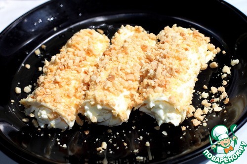 Трубочки обмазать майонезом с помощью кисточки. И обвалять в измельченных орехах. У меня орехи крупноватые вышли, советую помельче измельчить.