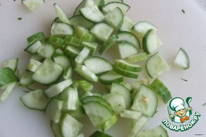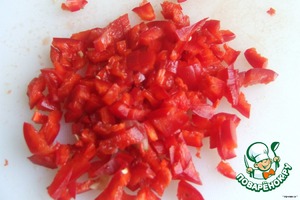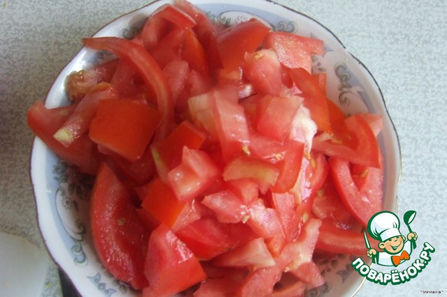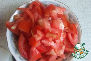 Помидоры разрезать пополам, удалить сердцевину и порезать на небольшие квадратики.