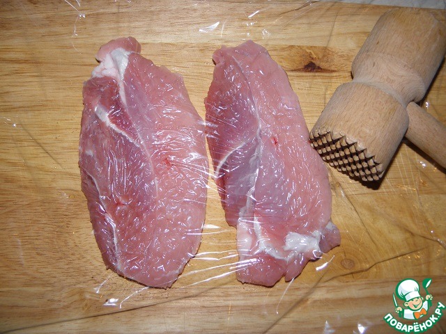 Мяса нарезать, порционными кусками, отбить ( кусочки должны быть средние, не тонкие, и не толстые). Посолить и поперчить.