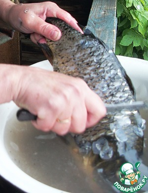 Полюбовались и приступаем к приготовлению. Рыбу чистим от чешуи, я набираю блюдо воды опускаю рыбу и чищу с хвоста к голове. Затем потрошим, отрезаем голову и хвост, ножницами обрезаем плавники, хорошо промываем под проточной водой. Голова и хвост пригодится для ухи.