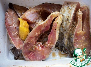 Выкладываем в просторную посуду в которой он будет мариноваться, посыпаем специями, солью (соевым соусом) выжимаем 0,5 лимона (можно целый если любите с кислинкой). Всё тщательно перемешиваем и оставляем на 30-60 мин (можно и больше).