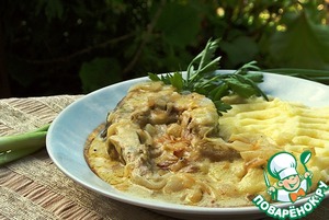 Выкладываем на рыбу жареный лук и заливаем соусом, убавляем огонь, закрываем крышкой и тушим 15 мин.