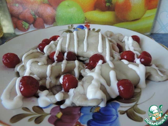 Сверху посыпаем вареники сахаром и украшаем вишней. Можно подавать со сметаной или вишневым соусом (для его приготовления вишню истолочь в ступке, добавить воду, перемешать и хорошо отжать через несколько слоев марли. Добавить сахар и прокипятить. Я не готовила, но буду рада, если кто-то попробует).
