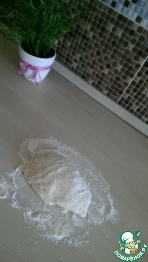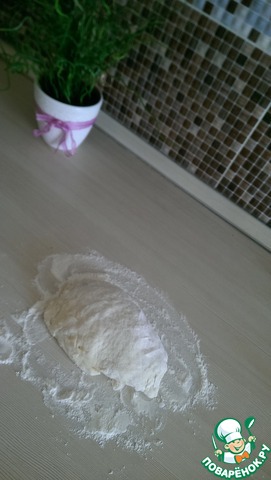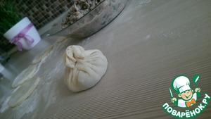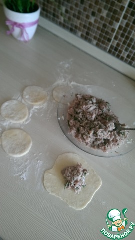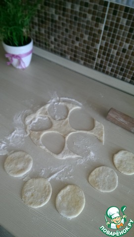 • Расскатываю толстым слоем тесто и бокалом вырезаю кружочки