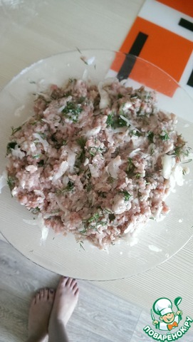 • Заливаю фарш молоком 0,5 стакана и перемешиваю