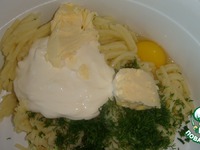 Картофель отварите, пропустите через мясорубку. Добавьте 1 сырое яйцо, сливочное масло, сметану, зелень, соль, перец и приправу, всё тщательно перемещайте
