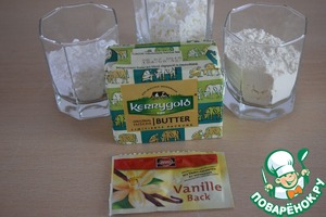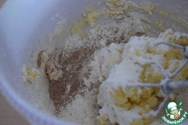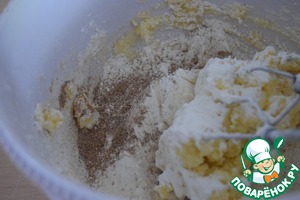 Добавляем муку, крахмал и семена ванильного стручка. Для этого стручок ванили разрезать вдоль и выскребсти мякоть. У меня стручка не было - я добавила ванильную добавку - пол пачечки. Все ингредиенты должны соединиться с маслом.