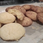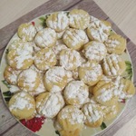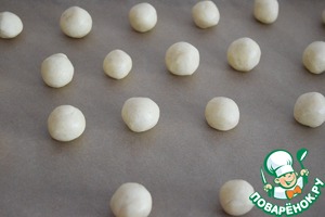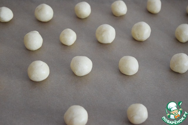 Тесто делим на 4 части. Каждую часть раскатываем в "колбаску" и разрезаем на 10 частей. Скатываем шарик размером с вишню и выкладываем на противень, застелённый бумагой для выпечки.