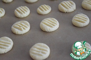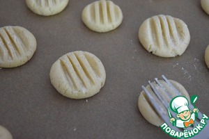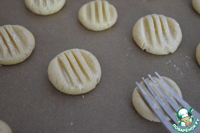 Теперь берем вилку, окунаем ее в муку и слегка вдавливаем на печенье, нанося вот такой оттиск.