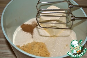 4. Для приготовления верхнего слоя просеять муку и перемешать с ореховой мукой, сахаром, корицей. Добавить нарезанное кусочками масло. Перетереть массу руками или с помощью двух вилок до состояния, похожего на хлебные крошки. Или воспользоваться миксером с венчиками для взбивания. И пока убрать в холодильник.