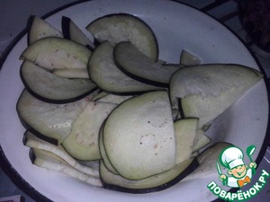 Баклажан у меня был крупный, поэтому я нарезала его полукольцами. Посыпаем солью, и добавляем 2 ст. л бальзамического уксуса. Перемешиваем, оставляем пропитываться.