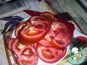 Кругами нарезаем помидоры.