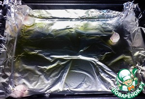 Ставим греть духовку до 180 градусов. Застилаем форму фольгой. Смазываем оливковым маслом. И кладем в форму 2 зубчика чеснока. Я не чистила, просто раздавила ножом, нам это нужно для запаха.