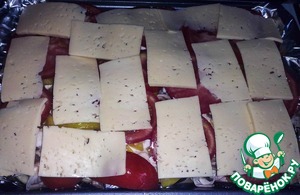 Последний слой кладем сыр. Я просто нарезала пластами. Можно и потереть. Отправляем в духовку на 40 минут.