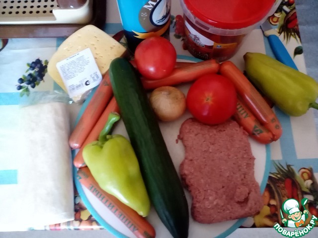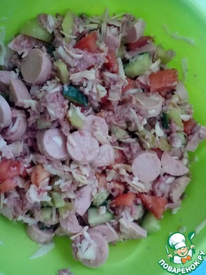 2. Все ингредиенты режем кубиками, сосиски полукольцами-кольцами. (огурчик ушел не весь, 2/3 на три пирога) Сыр на крупной терке. Для тех, у кого детки спят не час, а хотя бы побольше - можно поджарить фарш и лук. У меня времени на такие изыски нет, поэтому все в одну чашку, посолить. Добавить специи - кто какие любит.