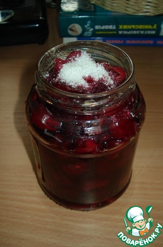 В банку укладываем вишни: 3 ст. л вишни и следующий слой 1 ст. л. сахара и так далее. Последний слой вишня > сахар и плотно уложить, слегка надавив на ингридиенты.