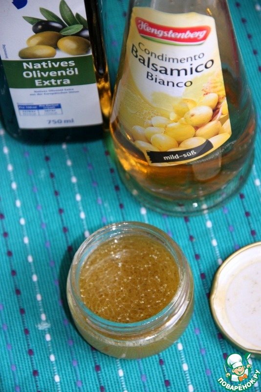 Приготовить заправку: взболтать в баночке (взбить вилкой) оливковое масло с бальзамическим уксусом, солью и перцем.