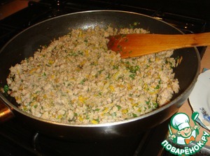 Обжариваем на растительном масле лук, порезанный полукольцами. От себя я еще добавила морковку. Добавляем фарш, обжариваем. Солим, перчим. В конце от себя добавила еще зелени.