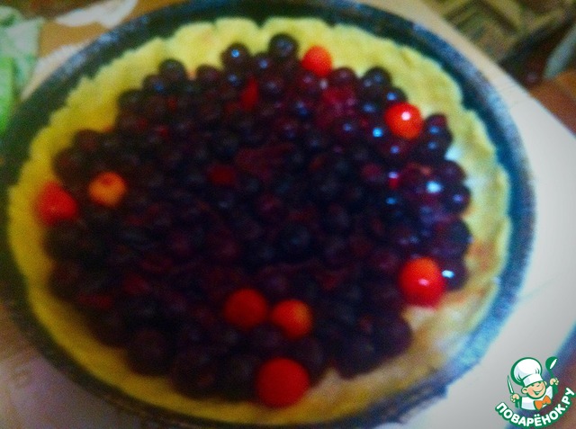 Выложить вишню с соком на тесто. (У меня немного черешни в начинке). Не бойтесь что много сока крахмал заберет лишнюю влагу и вишневый сок будет похож на желе.