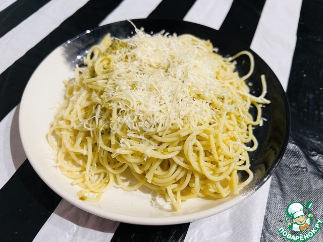 Пучок кинзы, пучок базилика, 2 зубчика чеснока, кедровые орешки, оливковое масло, сыр измельчите и тщательно перемешайте.