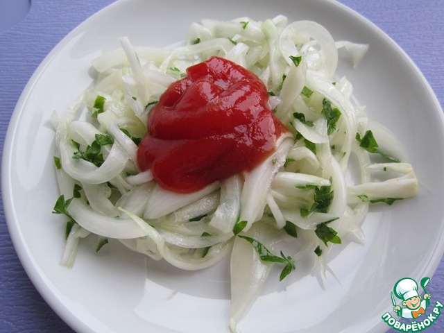 Лук обычный, репчатый. Кетчуп для одного салата взяла острый, в другом помидор вместо перца.